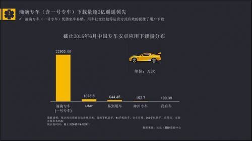 報告顯示,截止到2015年6月中國專車安卓應(yīng)用市場,滴滴打車(含一號專車)安卓應(yīng)用市場的下載量為22905.44萬次,Uber、易到用車、神州專車等專車應(yīng)用,分別以1078.8萬次、644.45萬次、162.7萬次分列行業(yè)二、三、四位。