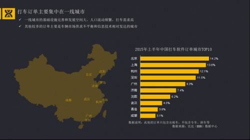 隨著移動出行市場的發(fā)展,打車軟件這個新生事物也逐漸成為人們出行選擇之一。據(jù)報告顯示,2015年審行半年中國打車軟件訂單城市TOP10分別是北京(14.2%)、上海(13.6%)、杭州(12.1%)、深圳(11.5%)、廣州(9.3%)、濟(jì)南(7.4%)、沈陽(6.2%)、武漢(4.5%)、青島(3.6%)、成都(3.1%)。